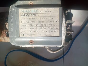 - 1 ədəd MARSU markalı elektrik su nasosu (şəbəkə: 220–240V, 50Hz; etiketdə texniki məlumat lövhəsi var). Korpus üzərində soyuducu fan, 220V şnur-bağlantı, giriş‑çıxış boru yivləri və drenaj boltları görünür.