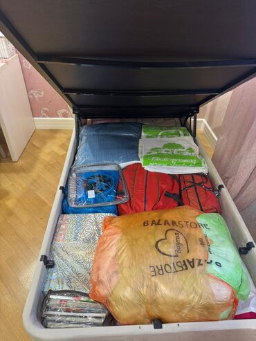 Yataq dəsti – qaldırılan mexanizmli sandıqlı çarpayı və döşək - Ölçü: təxmini tək nəfərlik (eni ~90–120 sm arası, uzunluğu ~190–200 sm). - Çarpayı: krem rəngli korpus, yumşaq başlıq. Metal karkasl...
