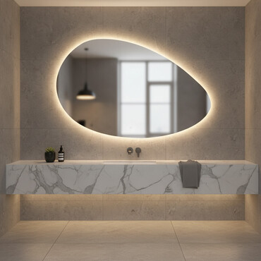 Organik formalı iri divar güzgüsü – LED arxa işıqlanma ilə - Dizayn: sərbəst dalğalı kontur, nazik qara çərçivə; müasir və minimal interyerlərə uyğundur. - Ölçü: tamboy (bütöv fiquru göstərir), də...