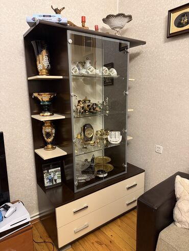 Şüşə qapılı, dekorativ bəzəkli vitrin mebeli təqdim olunur. Üst hissəsində qızılı rəngli oyma naxışlı dekorasiya mövcuddur. İki şüşə qapısı və iki qapalı alt hissəsi var.Mebel Lökbatana kimi pulsuz...