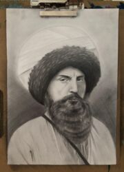 Dəri üzərində oyma təsvirli dekorativ tablo. - Mövzu: at üstündə döyüşçü fiquru, dinamik kompozisiya və milli motivli detallar - Material: relyef üsulu ilə işlənmiş təbii dəri panel - Çərçivə: kla...