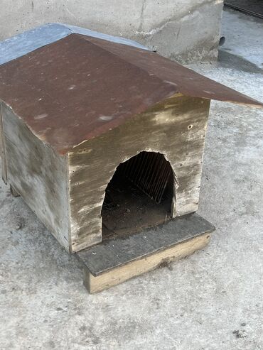Taxta it evi - Material: qalın taxta lövhələr, üstü faner/kontrplak damla örtülüb - Ölçü: orta ölçülü itlər üçün rahat daxili məkan (giriş qapısı taxta tağlı) - Konstruksiya: yerdən bir qədər hünd...