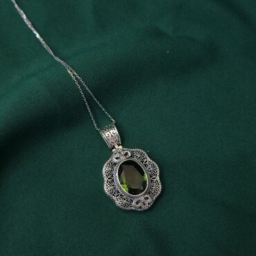 Gümüş 925 prob budaq formasında olan bu asma boyunbağı, zərif dizaynı ilə diqqət çəkir. Üzərində ağ bülluru ve tebii yaşıl rəngli qaşlarla bəzədilib. Həm gündəlik, həm də xüsusi günlər üçün uyğundur.