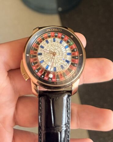 - Siferblat: mərkəzdə daş-bəzəkli, çoxrəngli rulet halqaları (qırmızı/qara/mavi indekslər), Jacob & Co loqosu