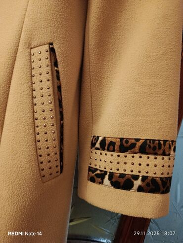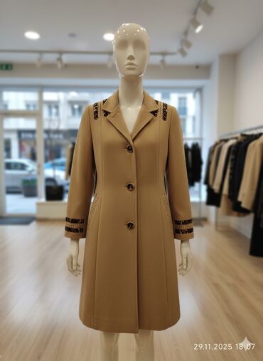 CREP qadın palto – Ölçü S - Rəng: klassik açıq bej/kamel - Üslub: ikicərgəli düymələmə, geniş haşiyəli yaxa (lapel) - Material hissiyyatı: sıx, isti və hamar toxuma (payız-qış üçün uyğundur) - Cib...