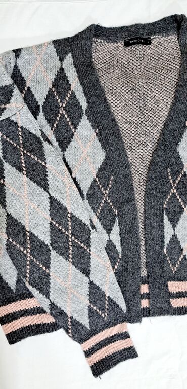 Trendvol brendi sviter - Ölçü: M/L (etiketdə) - Material: 100% akril - Rəng və naxış: Boz boğaz və ətək haşı ilə krem əsas, yaşıl, tünd mavi, qırmızı və bej tonlarında skandinaviya/ceometrik zolaql...