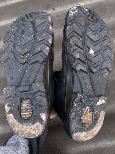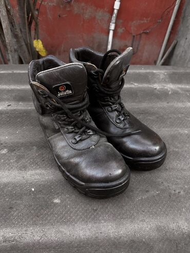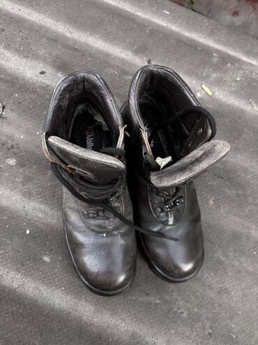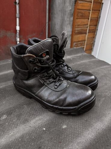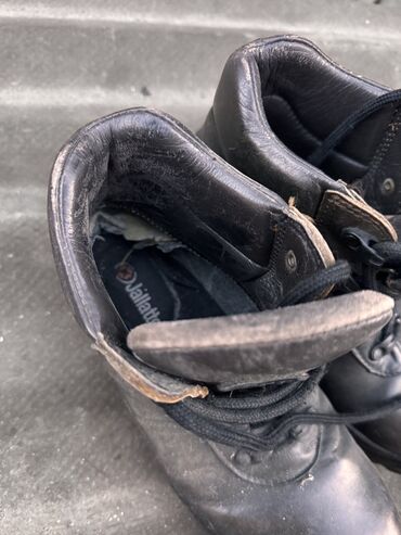 Qara rəngli yüksək boğazlı iş/əsgəri tipli çəkmələr - Material: təbii dəri üst, iç hissə süet teksturalı astarlı - Bağlanma: ön hissədə kordonlu, yuxarıda sürətli keçid üçün metal qarmaqlar - Altl...