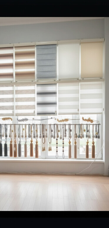 - Zebra pərdələr: işıqdarlığı tənzimləyən şəffaf/örtülü zolaqlı toxuma, manual zəncir mexanizmi, ağ alüminium kaset və alt profil.