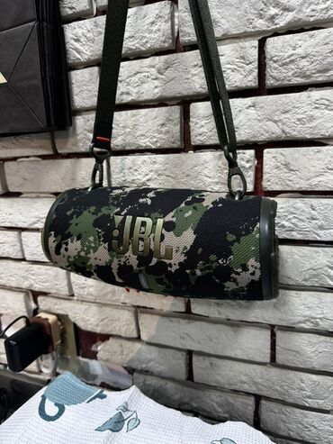 JBL portativ Bluetooth akustik sistemi – kamuflyaj dizaynlı silindrik model.