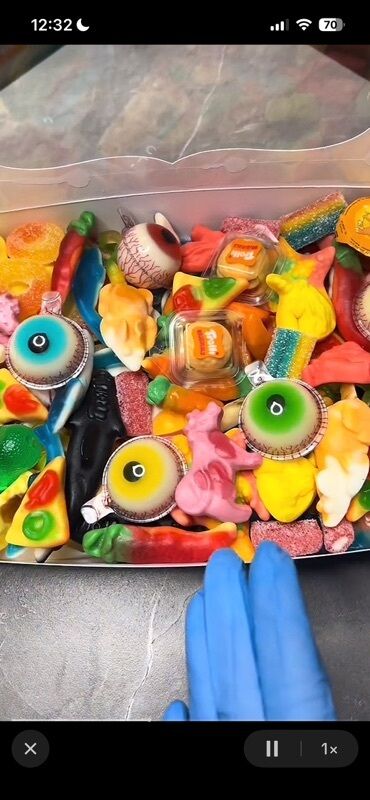 - İçlik: müxtəlif formalı və dadlı jelibonlar – ayı, delfin, ulduz, qurbağa, ilan, şirin–turş zolaqlar, halqalar, mumiya/şüşə formalı fiqurlar, “göz bəbəyi” tipli jelibon kapsulları, qara balina, pendir və pizza dilimi formalıları və s.