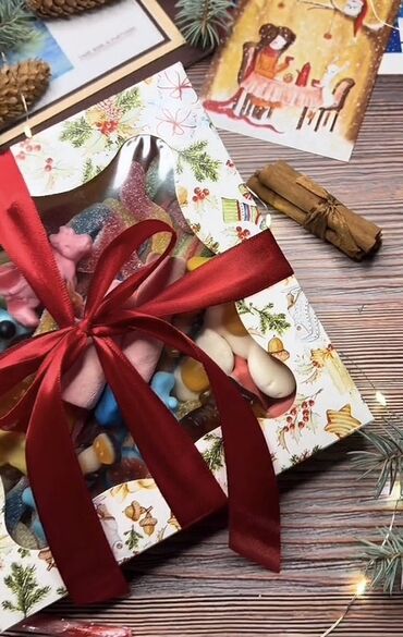 - Bayram və xüsusi günlər üçün dizayn olunmuş bəzəkli karton qutu: pəncərəli üst hissə, qırmızı lent və açıqca ilə.