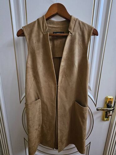 Qəhvəyi rəngli trikotaj jilet/kardiqan - Model: qolsuz, V-yaxa - Tekstura: sıx toxunma, xırda naxışlı - Material hissi: yumşaq trikotaj, elastik - Kəmər: eyni materialdan, beldən bağlanır - Uzunluq...