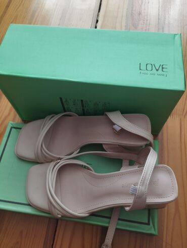 36 razmer..Bej rəngdə, dabanlı və qayışlı qadın səndəlləri. Ayaqqabıların ön hissəsində dekorativ daşlar var. Ziyafət və xüsusi günlər üçün idealdır.