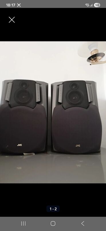 - Qutuda iki 3‑yollu JVC akustik kolon: yuxarıda ayrı tweeter və orta diapazonlu dinamik, aşağıda bas bölməsi; ön qoruyucu tor