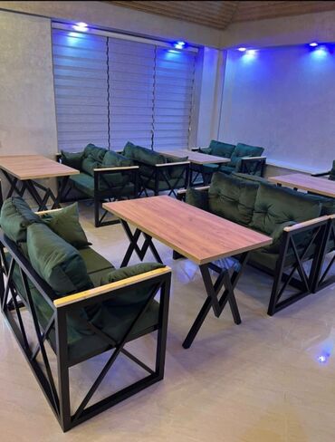 Metall karkaslı kafe/ev oturma dəsti - Komplekt: 1 ədəd dikdörtqan masa + 2 ədəd ikinərlik divan - Stil: loft/industrial - Rənglər: qara metal karkas, açıq ağac fakturalı masa üstü və qolluqlar, ş...