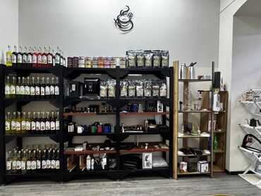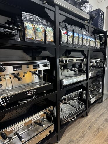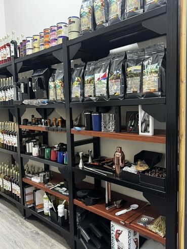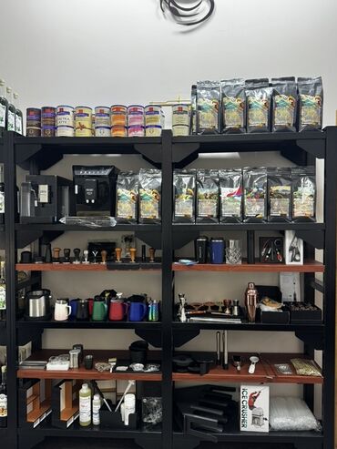 - Şəkillərdə gördüyünüz kimi, rəflərdə geniş assortiment mövcuddur: qəhvə, sirop, toz qarışıqlar, aparat və bütün lazım olan barista alətləri bir məkanda.