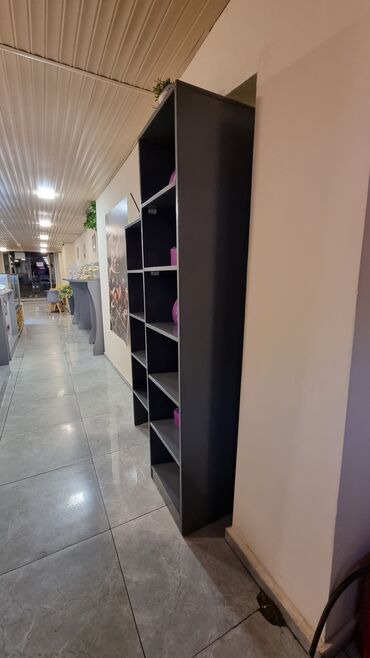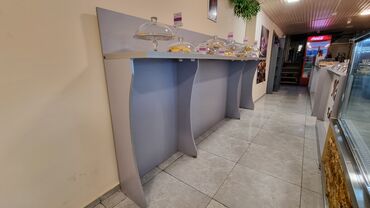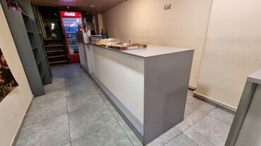 - Modul tipli uzun servis tezgahı: boz-ağ rəng palitrası, möhkəm laminat/LDSP səth, düz kənarlar, rahat iş zonası.