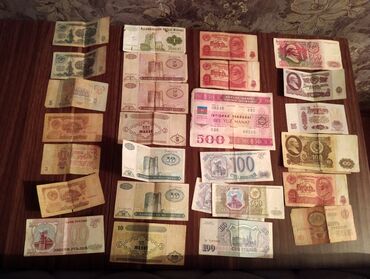- SSRİ/Rusiya rublu: 1, 3, 5, 10, 50, 100, 200, 500 rublluq köhnə banknotlar (müxtəlif illərin dizaynları, memarlıq və tarixi fiqur təsvirləri).