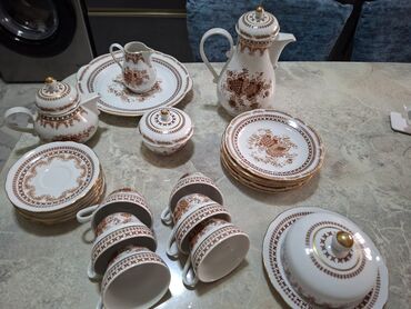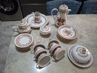Klassik ağ porselen üzərində qızılı-qəhvəyi ornament və üzüm-buket motivləri. Qızılı haşiyələr, qapaqlarda dekorativ qızıl knopkalar.