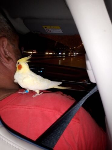Ağ rəngli kakadu quşu, sarı dimdikli, avtomobildə sərnişinin çiyinində oturmuşdur. Quşun ayağında mavi üzük var. Sarı lələkli başı və narıncı yanaq ləkələri ilə seçilir. Quşun arxasında gecə vaxtı işıqlı yol görünür. Evdə saxlamaq üçün uyğundur.