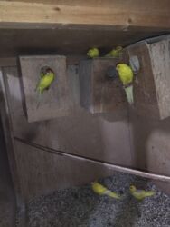 Növ: Dalmatika (büdciger) papuqayları cütü Rənglər: - Tam sarı (lutinio) - Yaşıl-sarı, zolaqlı başlı Xüsusiyyətlər: - Sakit və sosial quşlardır, cüt olaraq qəfəsdədirlər. - Təbii taxta t...