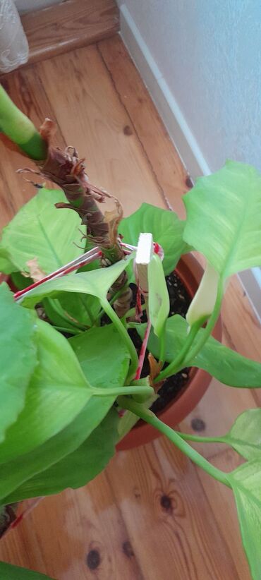 Böyük yaşıl yarpaqları olan bir alokasiya bitkisi. Bitki qəhvəyi