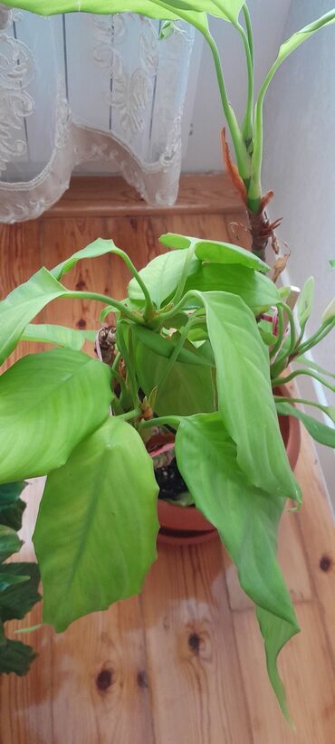 Ev üçün dekorativ otaq bitkiləri dəsti - Fil qulağı/alokaziya tiplı böyük yarpaqlı bitki – hündür boylu, iri ürək formalı yarpaqlar, keramik dibçək və altlıqla. - Spatifillum (Sülh zanbağı) – bir ...