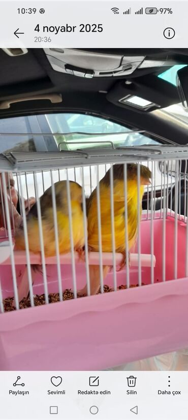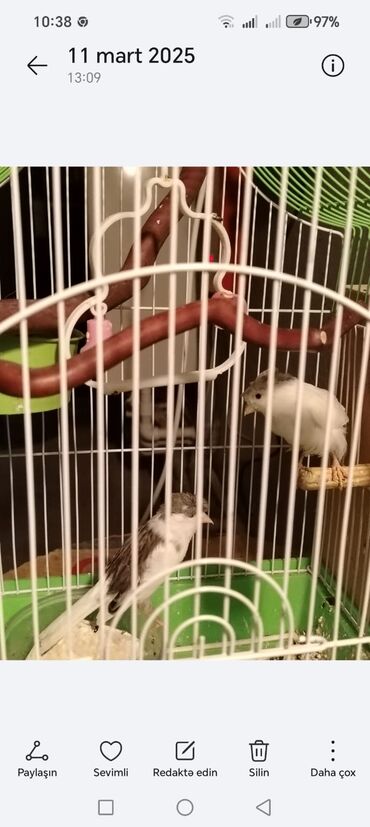 - Qəfəsdədir, plastik yemlik və bidonlu su qabı, perch/oturacaq çubuqları ilə