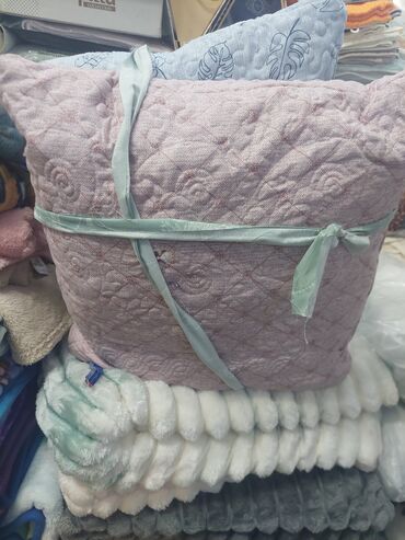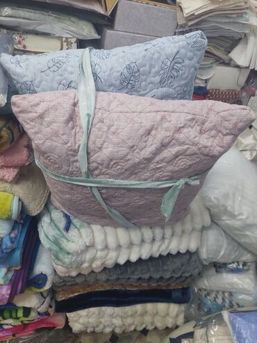 - Yastıqlar: Kişik və böyük ölçülərdə, dekorativ tikişli qoltuq/yataq yastıqları. Çəhrayı və açıq mavi rənglərdə, bitki naxışlı və quilted (kapitone) səth.