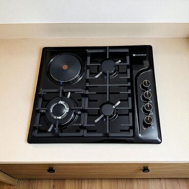EZEL quraşdırılan qarışıq soba paneli - Yanacaq növü: 3 qaz ocağı + 1 elektrikli disklik (solda) - İdarəetmə: sağ zolaqda 4 ədəd fırlanan mexaniki düymə - Alov mənbələri: fərqli ölçülü üç qaz gözü...