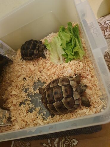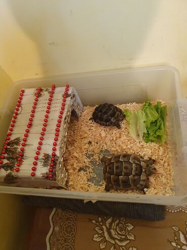 Kiçik tısbağalar satılır, mavi plastik akvarium. Akvariumun içərisində su və dekorativ palma ağacı var. Evdə və ya ofisdə saxlamaq üçün əlverişli seçimdir,akvariumda satılır. 1 - 25 azn