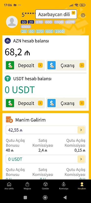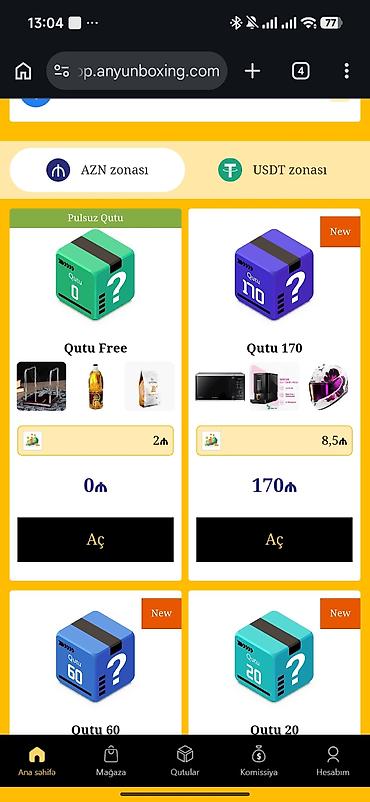 - Qutular: Free (0 ₼), 20 ₼, 60 ₼, 170 ₼, 600 ₼, 1900 ₼ və s.