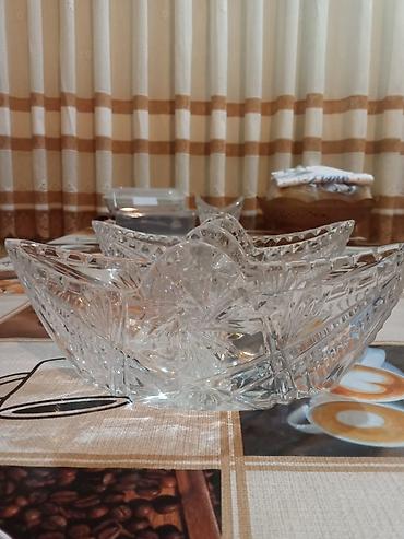 Xrustal meyvə qabı. Material: xrustal Rəng: Şəffaf Say: 3 ədəd Forma: Dairəvi Naxış: Həndəsi Səth: Hamar Ölçü: Orta Çəki: Yüngül Yuma: Əl ilə İstifadə: Meyve qabi Təyi...