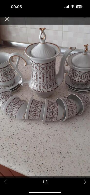 Porcelain çay dəsti - Zərif ağ porselndan hazırlanmış, qızılı haşiyəli və naxışlı dizayn - Dəst tərkibi: - Qapaqlı çaydan (uzun lüləli) - Qapaqlı şəkərqabı - 6 ədəd fincan - 6 ədəd fincan ...