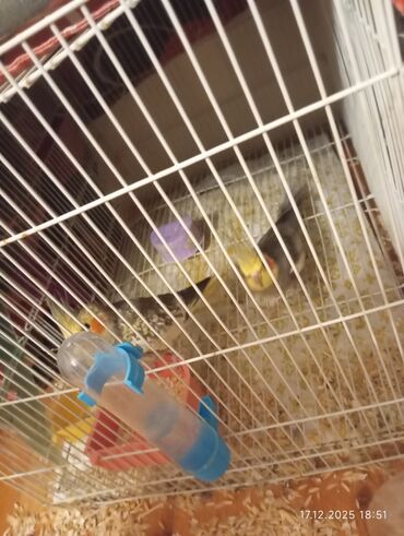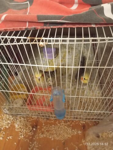 Nymph (kokatiel) cütü və qəfəsi - Növ: Nymph (kokatiel) – sarı başlı, yanaqlarında narıncı ləkəli, müxtəlif naxışlı tüklər - Say: 2 quş (cüt) - Aksessuarlar: möhkəm metal qəfəs, taxta bidonlar/otu...