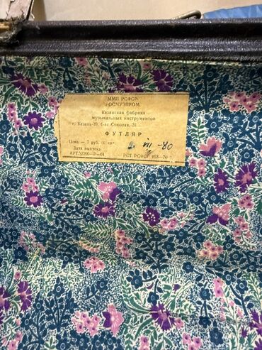 - Çantası var: iç hissəsi çiçək naxışlı parça ilə örtülüb; qapağın içində fabrik etiketində “Казанская фабрика музыкальных инструментов” göstərilir.