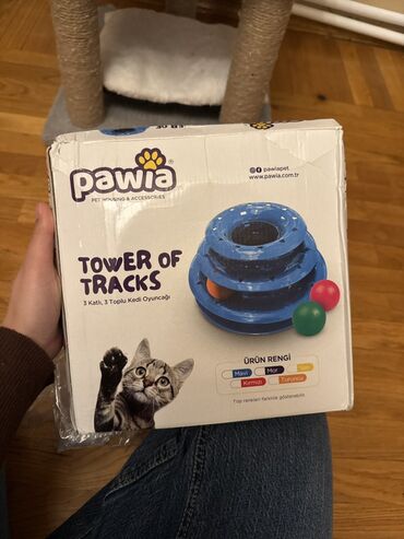 - Pawia “Tower of Tracks” 3 qatlı, 3 toplu kedi oyuncağı (qablaşdırmada göstərilən rənglər: mavi, qırmızı, mor, narıncı, sarı; topların rəngi fərqli ola bilər)