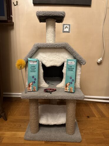 - Çoxmərtəbəli kedi evi/oyun ağacı: aşağıda yumşaq platforma, ortada girişli evciyik, yuxarıda müşahidə meydançası; sütunlar sisal iplə sarınmışdır; yan tərəfdə yaylı tüklü oyuncaqlı