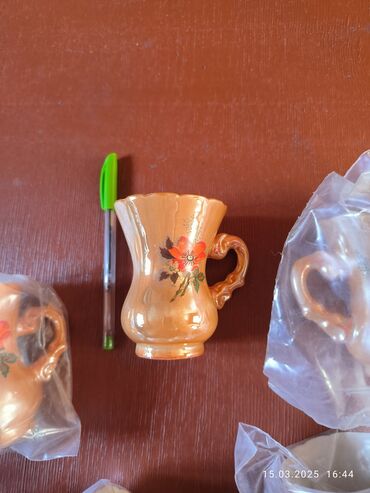 - Naqiş: hər fincanda əl işi görünüşlü çiçək motivi (narıncı çiçək və yaşıl yarpaqlar)