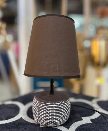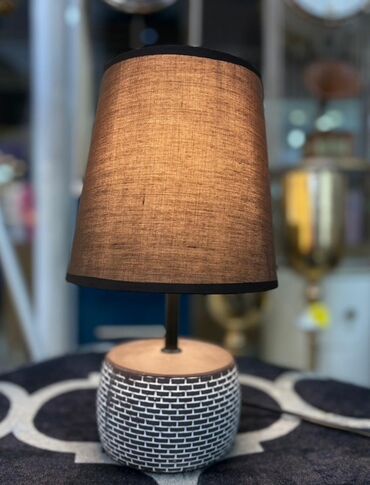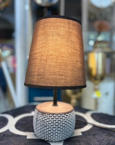 Masaüstü abajur – keramika gövdəli, parça şapkali - Dizayn: Silindrik keramika baza üzərində kərpic naxışlı faktura; klassik konus formalı parça abajur. - Rənglər: Gövdə boz/qaraya yaxın tonlarda ...