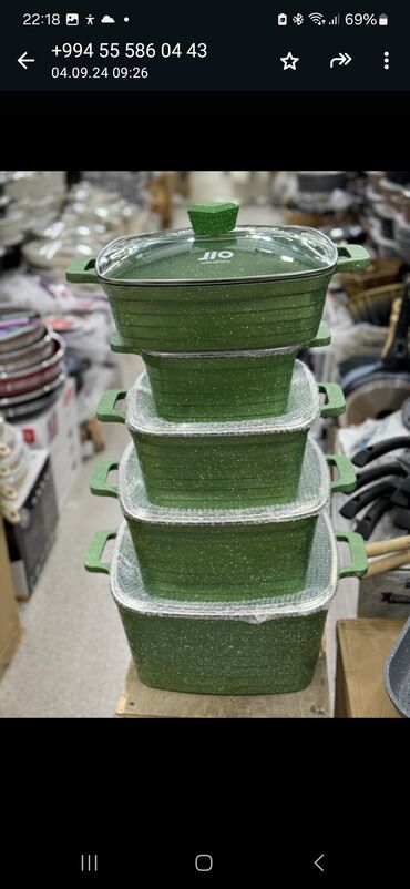 1. Qazan dəsti. Burdan alınmayıb. Qalın 3 qat örtükdən hazırlanıb. Yapışmayan material. Karobkası üstə ətraflı məlumatı oxuya bilərsiniz. 2. Qazan dəsti. Təzə. Rəng göy. Qiyməti 80 azn