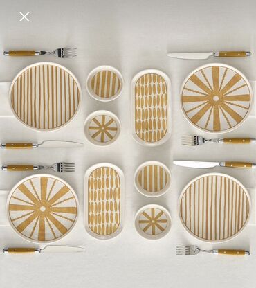 - Formlar: dairəvi yemək boşqabları, kiçik dairəvi qablar/ramekinlər, oval servis boşqabları və uzun dar traylar