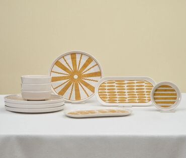 Karaca Keramika yemək dəsti – ağ fon üzərində xardal-sarı naxışlar