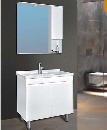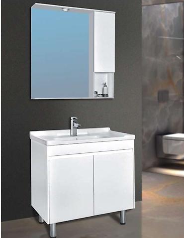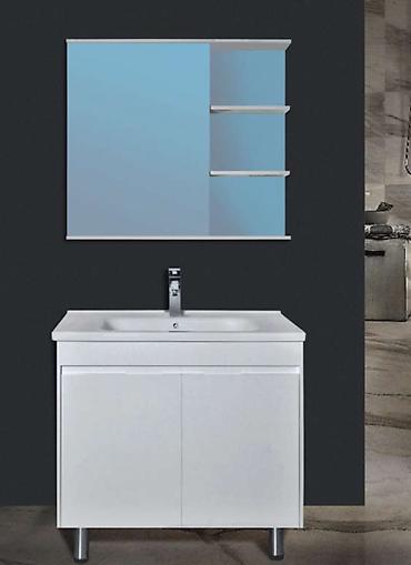 Banyo mebeli dəsti – lavabo altı dolab və güzgü paneli(moydodır) - Rəng: ağ, minimalist dizayn - Lavabo: inteqrə edilmiş geniş səthli keramika üstlük, tək kran üçün yer - Dolab: divardan asma kons...