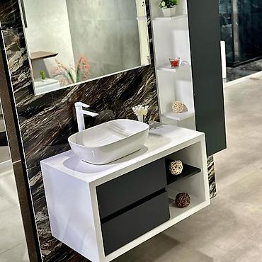 Hamam aksesuarları və sanitariya avadanlıqları dəsti - Asma hamam mebeli: Ağ rəngli, şaquli relyefli fasadlı, mərmər effekti olan üst panel. Variantlar: - 1 çekmecəli komod + dairəvi güzgü - 2...