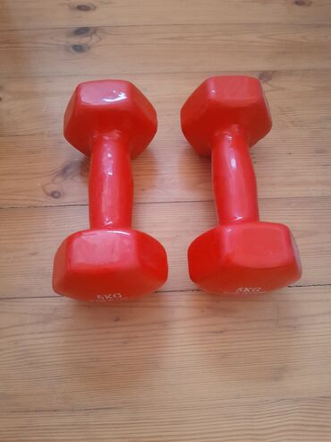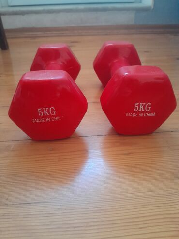 5 kq-lıq vinil örtüklü dambell dəsti - Çəki: hər biri 5 KG (cəmi 10 KG) - Rəng: parlaq qırmızı - Forma: altıbucaqlı başlıqlar – yerə qoyulduqda diyirlənmir - Örtük: hamar vinil/poliuretan tipli sə...