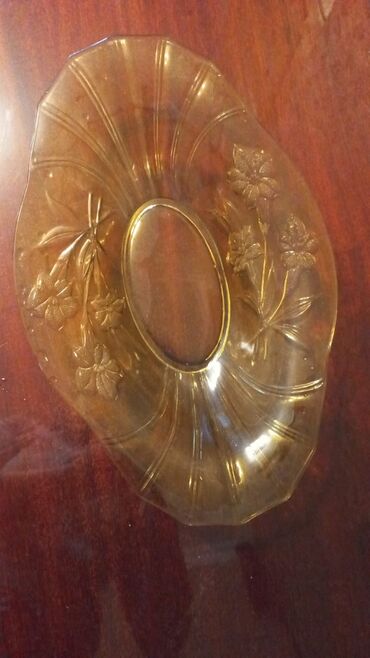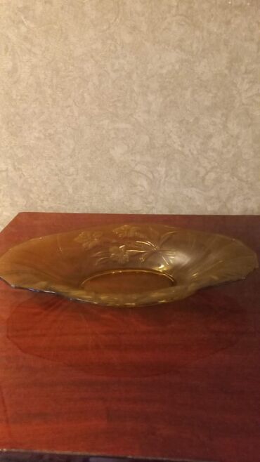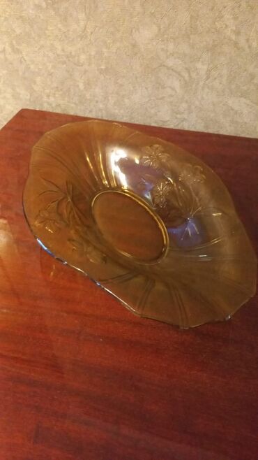Şüşə meyvə/salata qabı - Material: şəffaf şüşə, kristal üslubunda kəsim naxışları - Forma: oval, dərinlikli - Dizayn: dalğalı/saw kənarlar, yarpaqvari və romb kəsim ornamentləri, işığı gözəl əks e...