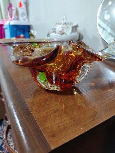 Kəhrəba rəngli şüşədən hazırlanmış bu dekorativ qab, qeyri-adi və fərqli dizaynı ilə diqqət çəkir. Qabın kənarları dalğalı formaya malikdir və içərisində şəffaf şüşənin kəhrəba çalarları ilə birləşməsi ona cəlbedici görünüş verir. İç hissəsində yüngül yaşıl rəngli vurğular da mövcuddur. Bu qab evdə bəzək əşyası kimi istifadə oluna bilər və ya kiçik əşyaların saxlanması üçün ideal seçimdir.