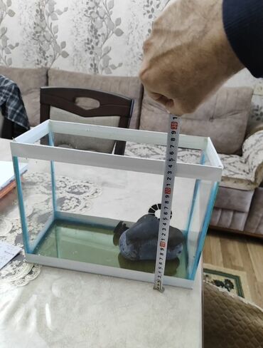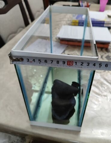 Şəffaf şüşədən hazırlanmış, ağ haşiyəli kiçik düzbucaqlı akvarium. Təxminən 30 sm uzunluğunda, 15 sm enində və 20 sm hündürlüyündədir. İçərisində bəzək əşyası və dibində bir qədər substrat var. Kiçik balıqlar və ya su bitkiləri üçün uyğundur. Ev və ya ofis dekorasiyası üçün əlverişlidir.