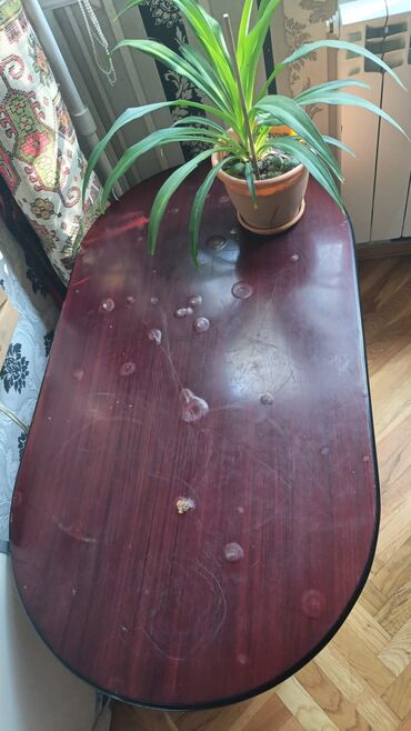 Endirim olunur. Az işlənibdir, qədimi stoldur, sınığı yoxdur. Oval formalı, qəhvəyi rəngli taxta yemək masası. Masa səthi parlaq örtüklüdür və üzərində naxışlı dizayn var. Dörd əyri ayaq masaya zə...